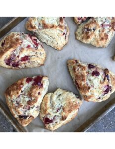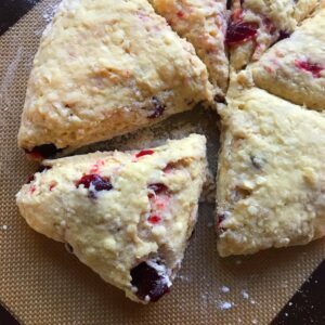 These pretty little scones are great with coffee for breakfast or dessert and pack well for picnics and outings. Best made a day ahead of time, the recipe is very forgiving and can be adapted to what you have available. I have made these with milk, cream, buttermilk, and each time they have been greeted with rave reviews. These scones are extra tasty made with chocolate chips, nuts, and coconut, too.